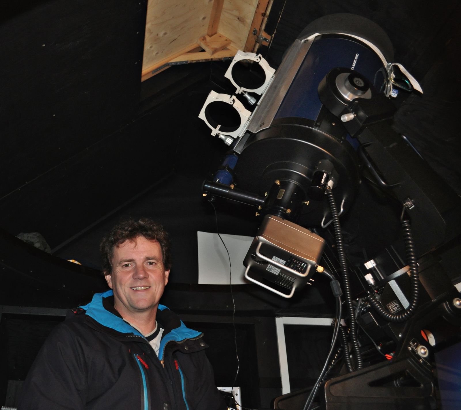 Höfundur við tækjabúnaðinn sem var notaður við mælingarnar. Búnaðurinn er uppsettur í varanlegri aðstöðu. Sjónaukinn situr á miðbaugsstilltu stæði sem hvílir á steyptum stöpli til þess að fyrirbyggja titring. Hann er rafdrifinn og pólstilltur til þess að fylgja göngu stjarna yfir hvelfinguna á sem jafnastan hátt. Fyrir vikið haldast stjörnur kyrrar í sjónsviðinu meðan mælt er. Ljósflögumyndavélin er áfest hjástefnubeini og sjónaukanum.