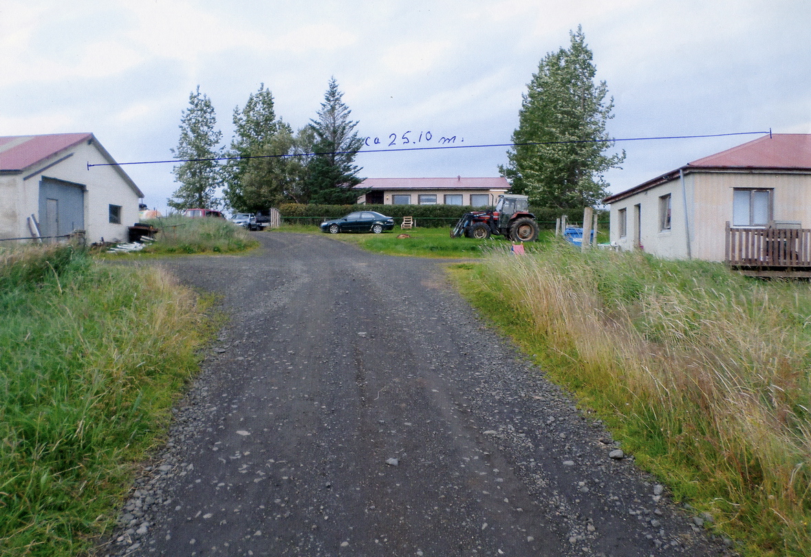 Mynd 2 Færsla sólar á himni um sólstöðurnar er afar hæg, og áberandi breyting á skuggastefnu milli ára sýnist í fljótu bragði ólíkleg. Ef staða sólar er reiknuð fyrir sama dag og tíma (21. júní kl. 03:45) fyrir fjögur ár, 2015 til 2018, kemur í ljós að mesti munur á sólarhæð er aðeins 0,007° og munur á sólarátt 0,033°. Til samanburðar skal minnt á að þvermál sólar á himni er 0,5°. Fjögur ár mynda eina hlaupársöld. Vegna hlaupáranna verða breytingar á stöðu sólar við sama mánaðardag í fjögurra ára sveiflu, mest nálægt jafndægrum en minnst um sólstöður. Ef við athugum færslu sólar vikuna kringum sumarsólstöður kemur í ljós að mesta breyting í sólarhæð kl. 03:45 er aðeins 0,07°. Lítum nú á myndirnar. Fyrsta spurningin sem svara þarf er þessi: Hvernig endurspeglar hreyfing skuggans á skemmugaflinum færslu sólar á himni. Með öðrum orðum: Hve langt færist skugginn fyrir hverja gráðu sem sólin færist á himninum. Svarið fer að sjálfsögðu eftir því hve langt skuggagjafinn (í þessu tilviki mænir á íbúðarhúsinu) er frá gaflinum sem skugginn fellur á. Garðar mældi þessa fjarlægð og reyndist hún 25,10 metrar (sjá mynd).